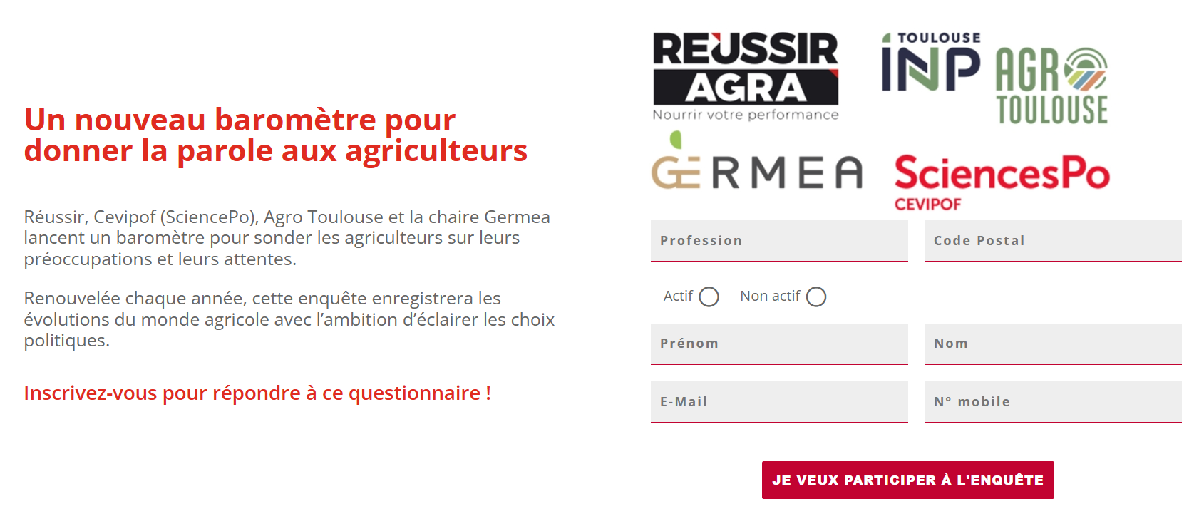 À ce jour, ils ont recueilli près de 800 réponses complètes. Cependant, les agriculteurs de la région Auvergne-Rhône-Alpes restent encore sous-représentés dans cette enquête. C’est pourquoi votre participation serait particulièrement précieuse. Seriez-vous disponible pour y répondre ? 📩 Remplissez le formulaire d'inscription, un lien unique et personnalisé vous sera adressé : https://agriagro.fr/barometre-reussir-cevipof/